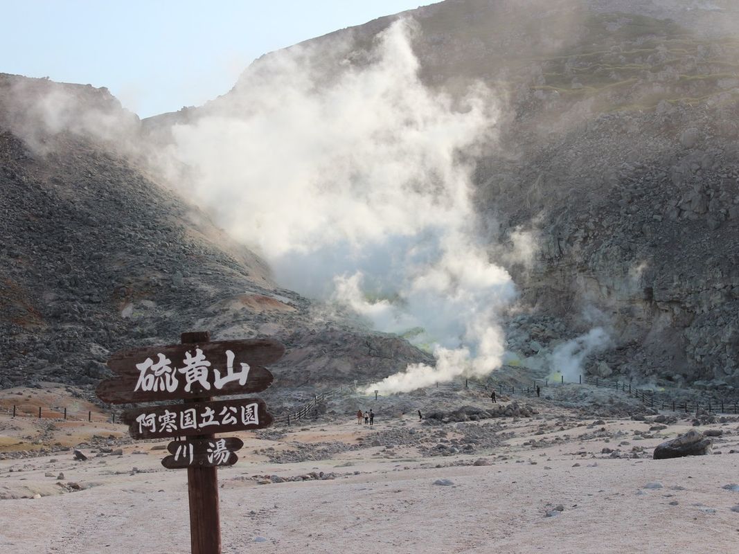 現在も活動する火山、硫黄山の麓には、噴気孔がたくさん。たちこめる噴霧と硫黄の香りは、火山の力強さを