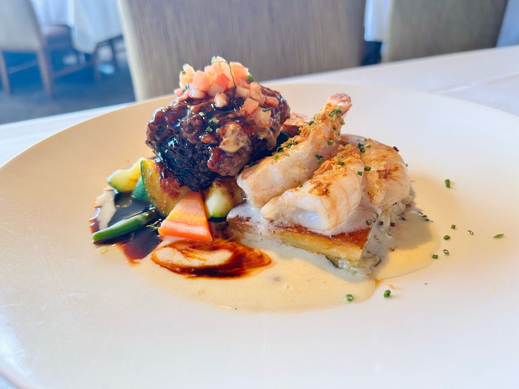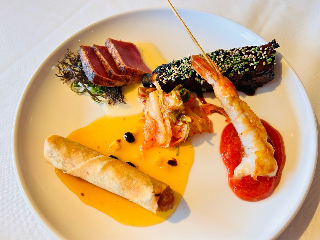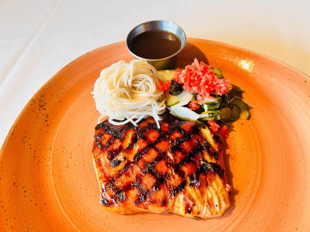 ●前菜盛り合わせ:マグロのたたき、 モンゴル風ポークリブ 焼いたシュリンプ、チキン春巻き ●シーザーサラダ ●メインディッシュ (1種類お選びください) 1.火鉢グリルの大西洋サーモン 2.ジェイドペストで蒸した白身魚 3.ショートリブの煮込みと焼き海老のデュオ 4.プチフィレ肉と白身魚のマカダミアナッツ風味のデュオ ●デザート ●コーヒー/紅茶 キッズメニュー:ケサディーヤチーズトライアングル/野菜スティック/パスタ、照り焼きチキン、ビーフショートリブ、グリルサーモン/アイスクリームから選択