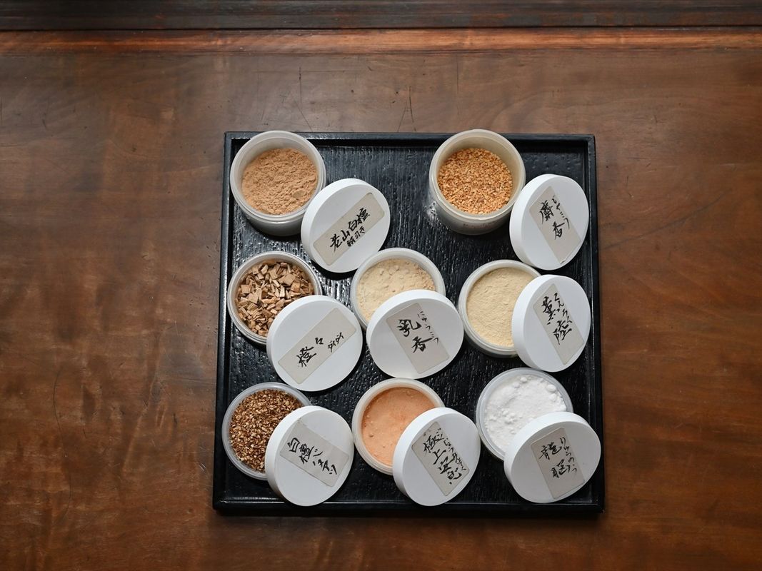 ほのかな甘さを含む親しみのある香りの白檀(びゃくだん)、50年以上もの歳月をかけて作られ、産地によって特有の香りを持つ沈香(じんこう)、生薬などから材料を選びます。それらを乳鉢に入れて合わせていきます。