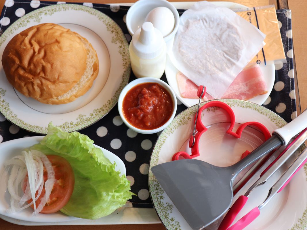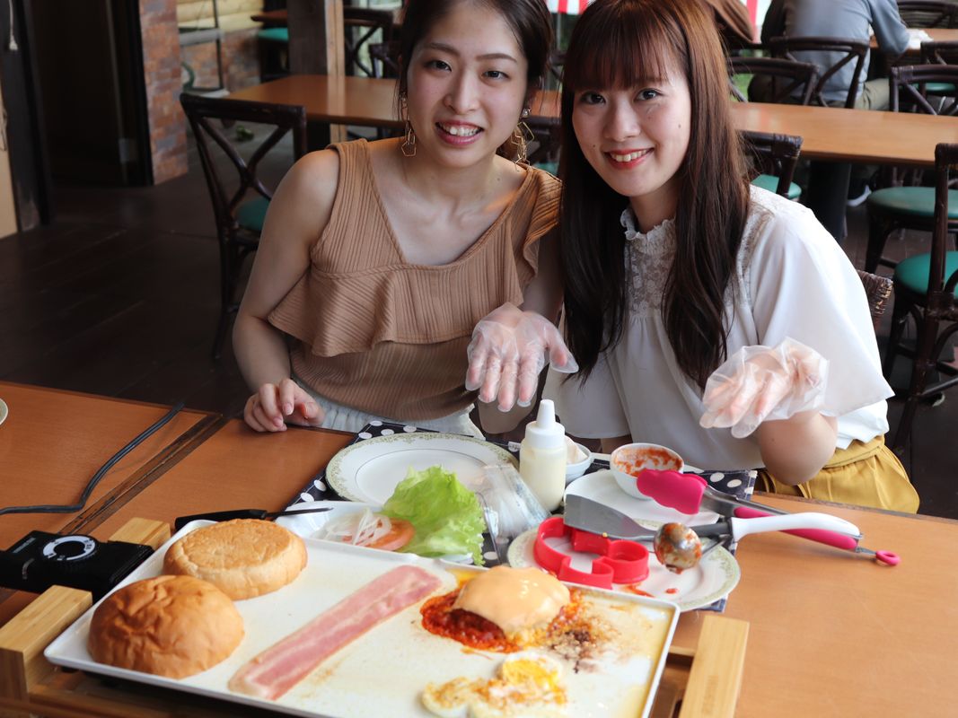 焼いたバンズの上に、マスタード、パテ、トマトソース、そして具をはさんでいきましょう♪具が大きくてはみ出るのもまたテンションがあがります。自社工房で焼かれたふわふわで香り高いバンズ。そして特製のトマトソース。香りにつられてつまみ食いしそうになるのをぐっとこらえてくださいね!