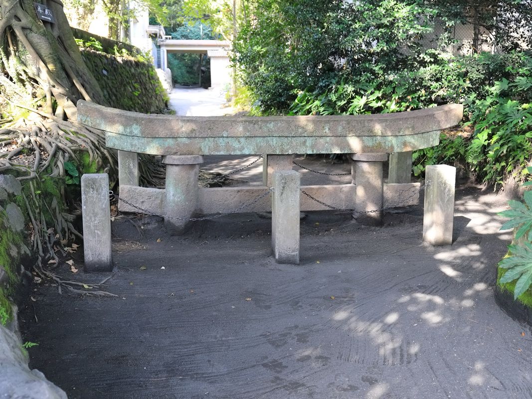 大正3年(1914年)に起こった桜島の大噴火で、もともと高さ3mあった鳥居も笠木を残して埋め尽くされました。噴火の脅威を後世に伝えるために、そのままの形で残されています。