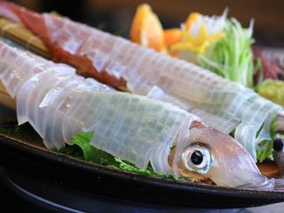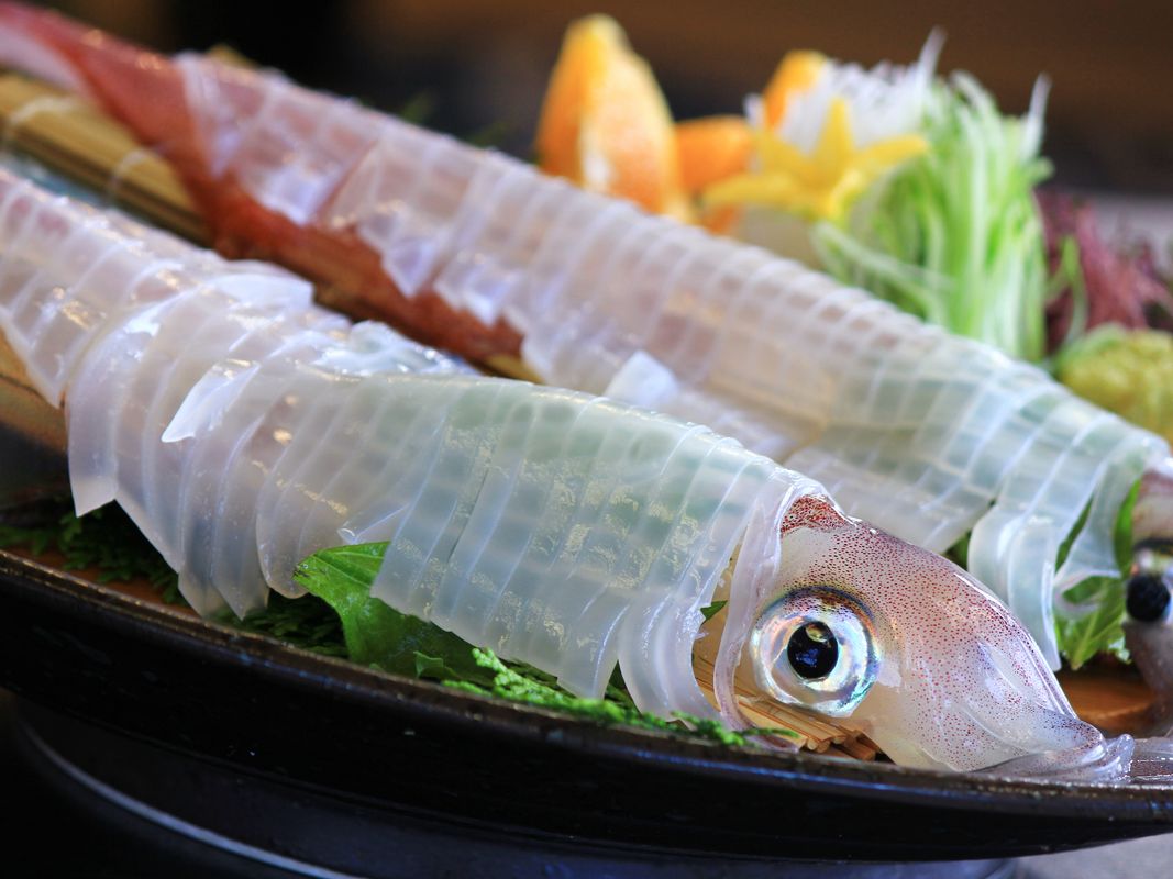 呼子を代表する料理といえばイカの活造り。新鮮な透明なイカの身は呼子に行ったら一度は食べてみたい一品!