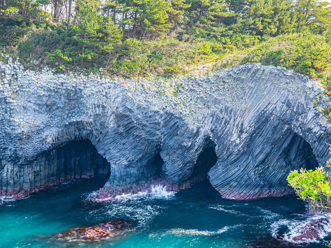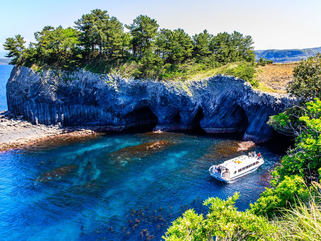 マリンパル呼子から出発する遊覧船に乗って、七ツ釜(ななつがま)を観光!奇岩景勝の地として知られる七ツ釜の洞窟は、まるで7つのカマドを並べたような海蝕洞窟で、玄武岩が積層した断崖の柱状節理は大迫力です。