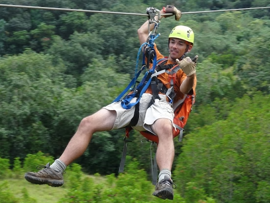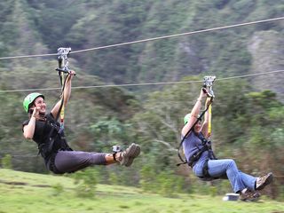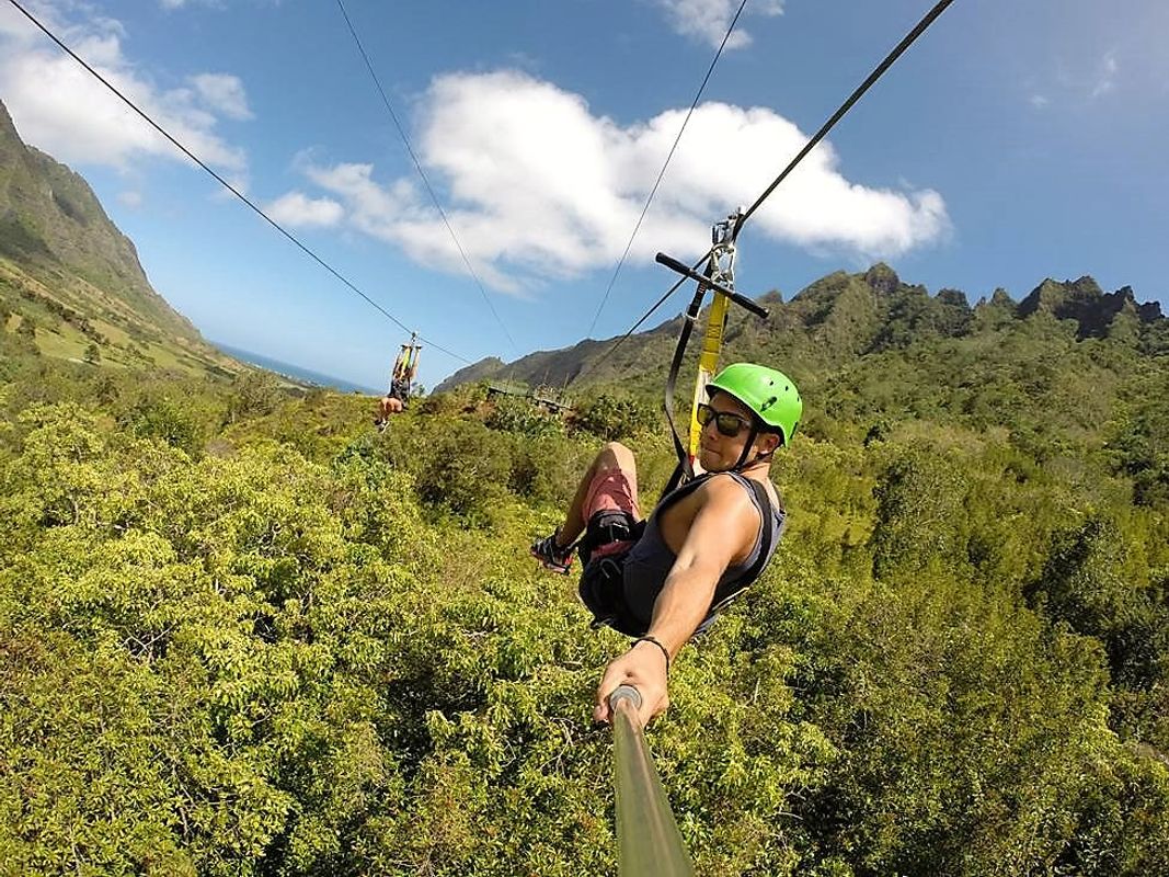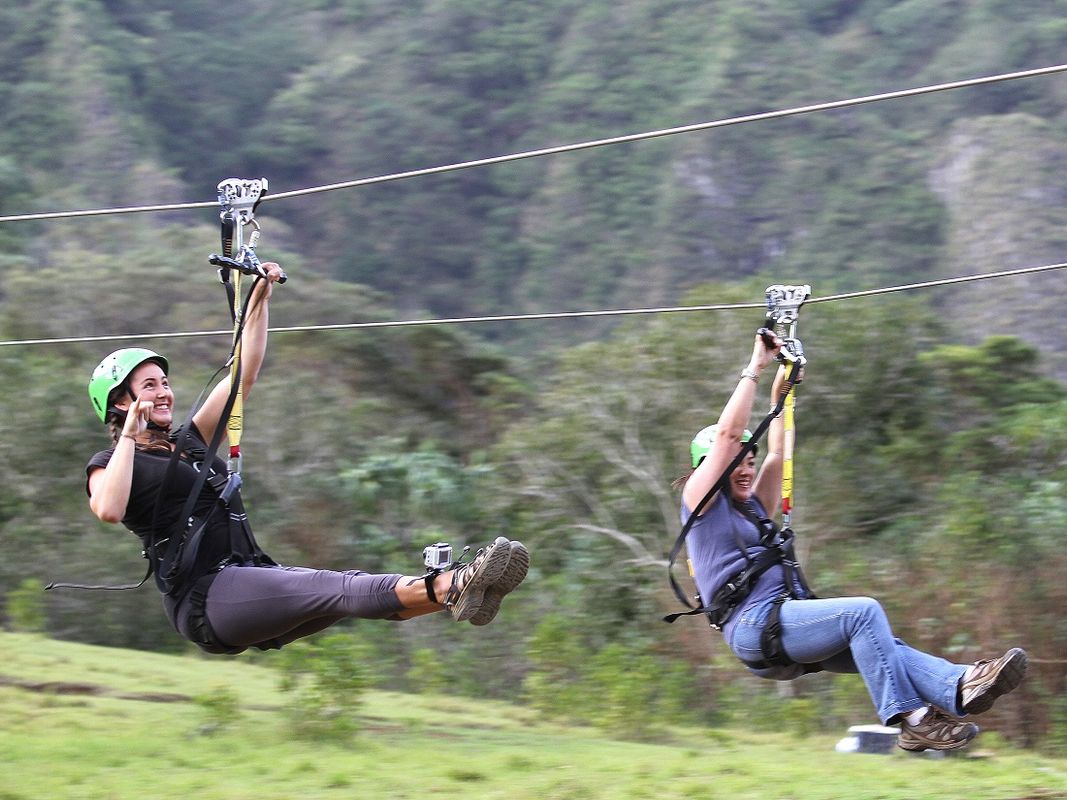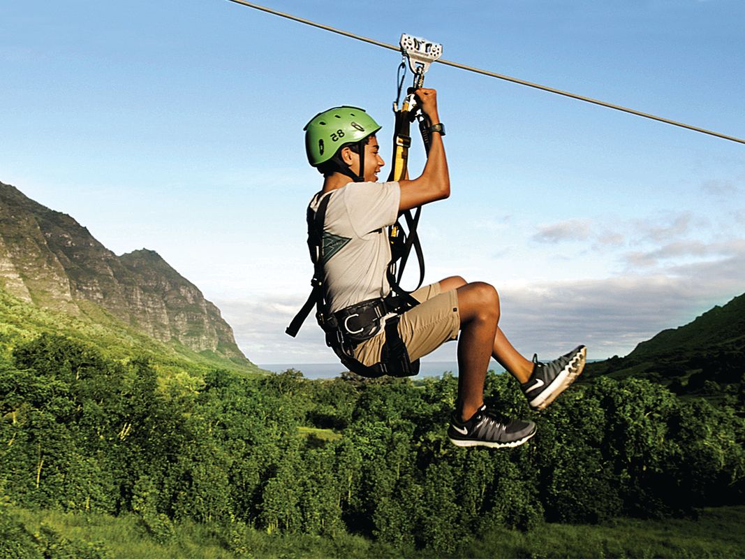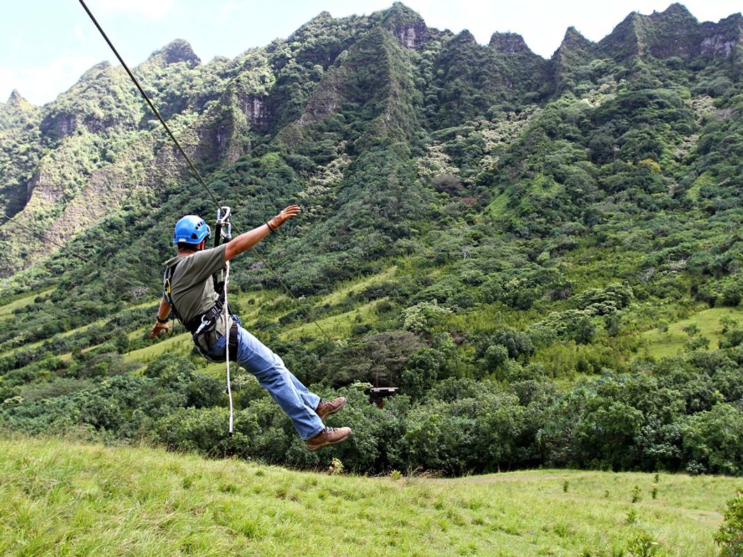 ジップライン(ZIP-LINE)は、木々の間に張られたワイヤーロープを、プーリーと呼ばれる滑車を使って滑り降りるスリル満点のアクティビティです。 オアフ島最大級を誇るクアロアランチのジップラインは、クアロア敷地内のカアアヴァ谷に7コースが設置され、最大高低差は約30メートル。ジップラインで滑り降りると、眼下に広がる大草原を眺め、コオラウ山脈に連なる山々と広がる大空を満喫することができます。