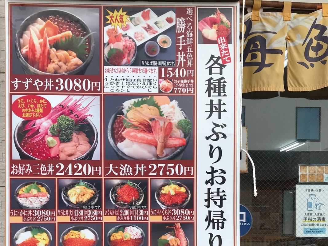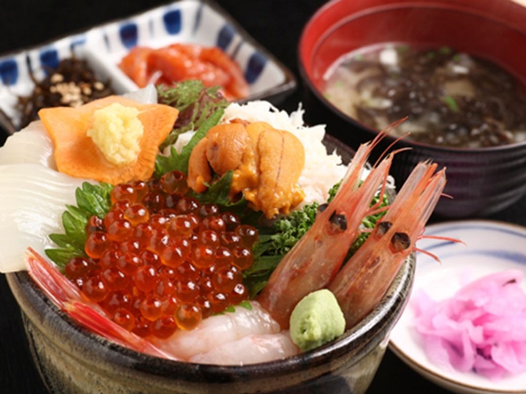 下記からお好きな具を5種類選んで海鮮丼に♪5種の海鮮に加え、生うにもさらにトッピングしたプランです。 - かにほぐし - 鮭ほぐし - 真いか - サーモンルイベ - 北海甘えび - ほたて貝 - ねぎとろ - とびっこ - いくら *全ての海鮮丼に、お味噌汁とお新香がつきます。