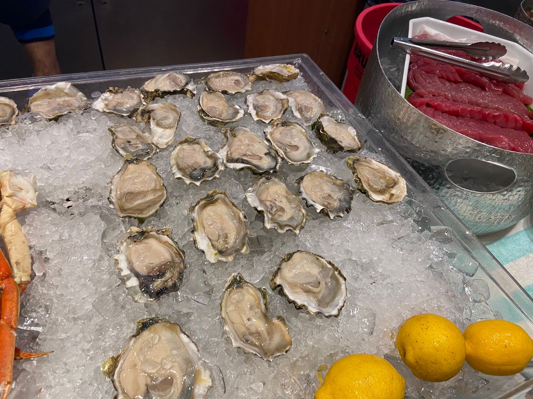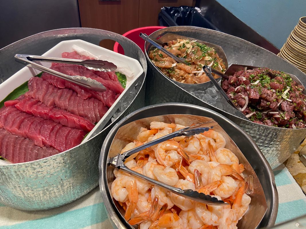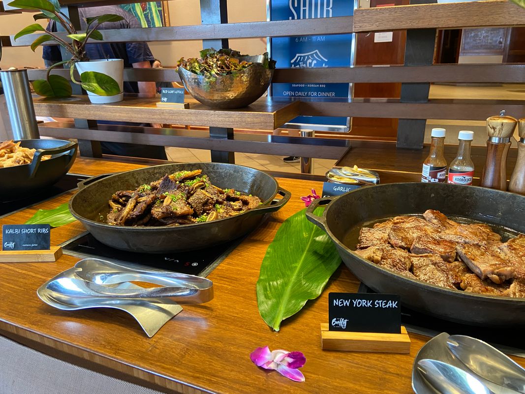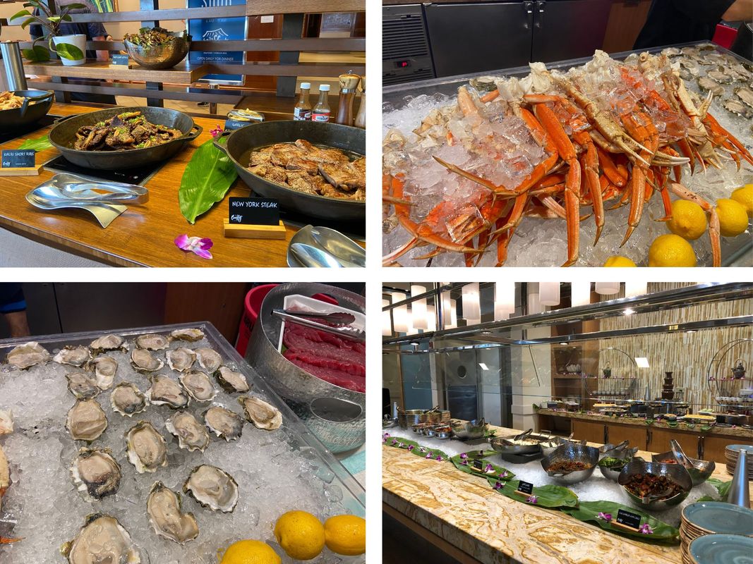 <ディナービュッフェの一例> 【バーベキューステーション】 ●カルビショートリブ ●ポークベリー ●リブアイステーキなど 【寿司&刺身ステーション】 ●和州牛のプルコギキンパ ●手巻き寿司 ●ハワイ近海で捕れた本日の鮮魚の刺身など 【シーフードステーション】 ●グースポイント産牡蠣 ●ズワイガニの蟹脚 ●シュリンプカクテルなど 【温かいお料理ステーション】 ●ベジタブルビビンバ ●キムチとベーコンのカルボナーラ ●ガーリックシュリンプなど 【韓国のおかずステーション】 ●もやしのナムル ●甘辛く煮付けたじゃがいも ●白菜のキムチなど 【デザートステーション】 ●グリーンティーチーズケーキ ●ホワイトチョコレートセサミバー ●フルーツタルトなど ※ビュッフェの内容は変更される場合があります。