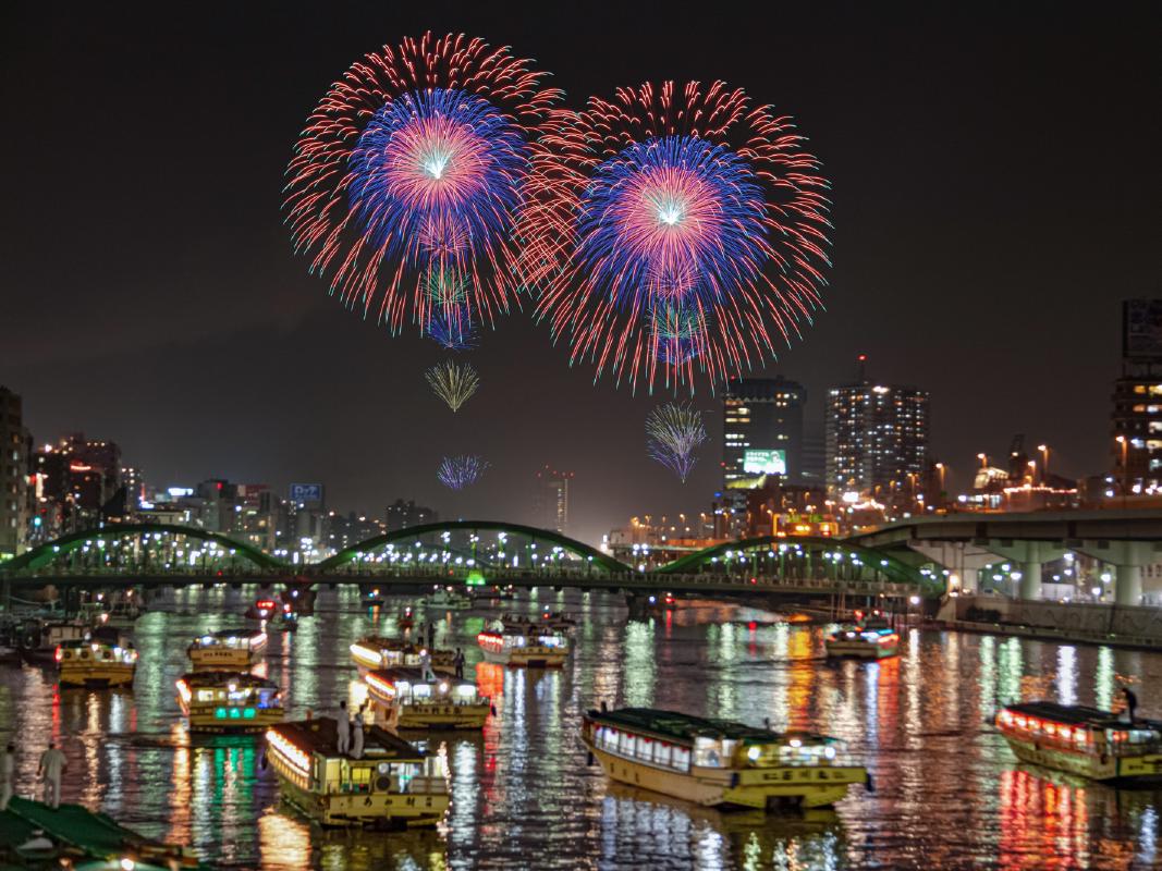 屋形船から冬の夜空に打ちあがる、ダイナミックな花火をお楽しみください。 *花火大会時のコース指定は無し