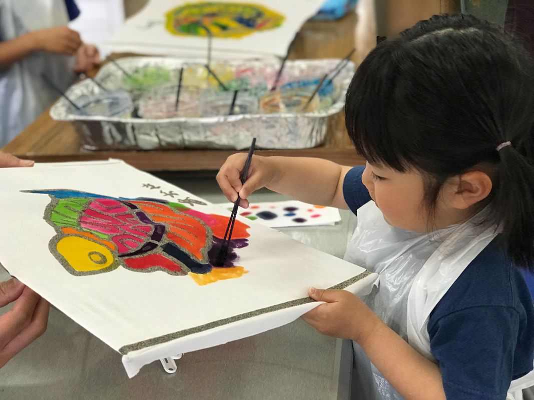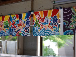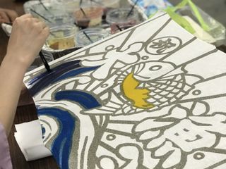 大漁旗は、漁船の帰港を知らせる旗で、縁起の良い絵柄で祝いを表します。このプランでは、「鯛」「亀」「鶴」「海老」「龍」「大漁旗」の6種類から好きな柄を選び、職人のように刷毛で染める体験ができます。完成した旗は鮮やかに発色し、印象が変わります。スタッフが丁寧に説明するので、子供から大人まで楽しめます。会場の亀染屋では、手ぬぐいなどの印染製品も購入が可能です。
