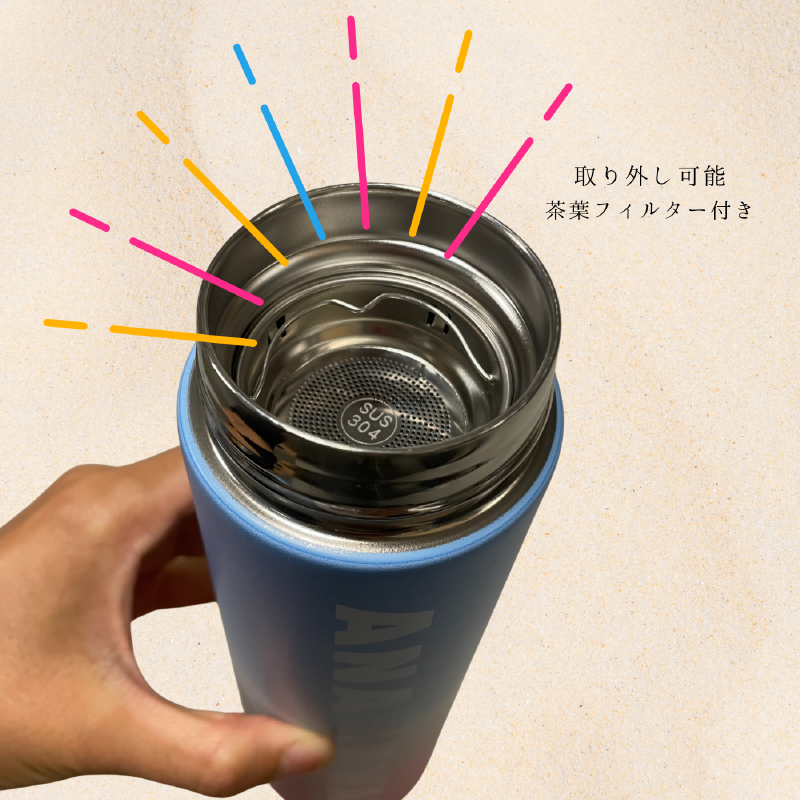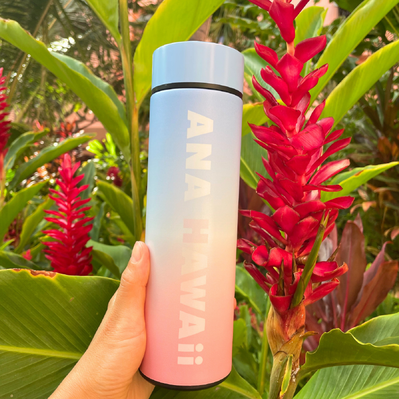 飲み物を長時間保温・保冷可能。取り外しが可能な茶葉フィルター付きの水筒で、お茶やフルーツティーにも最適です。ハワイらしいスカイブルーに、鮮やかなピンクのデザインです。 サイズ:幅 6.35cm x 高さ 21.59cm