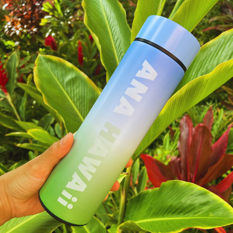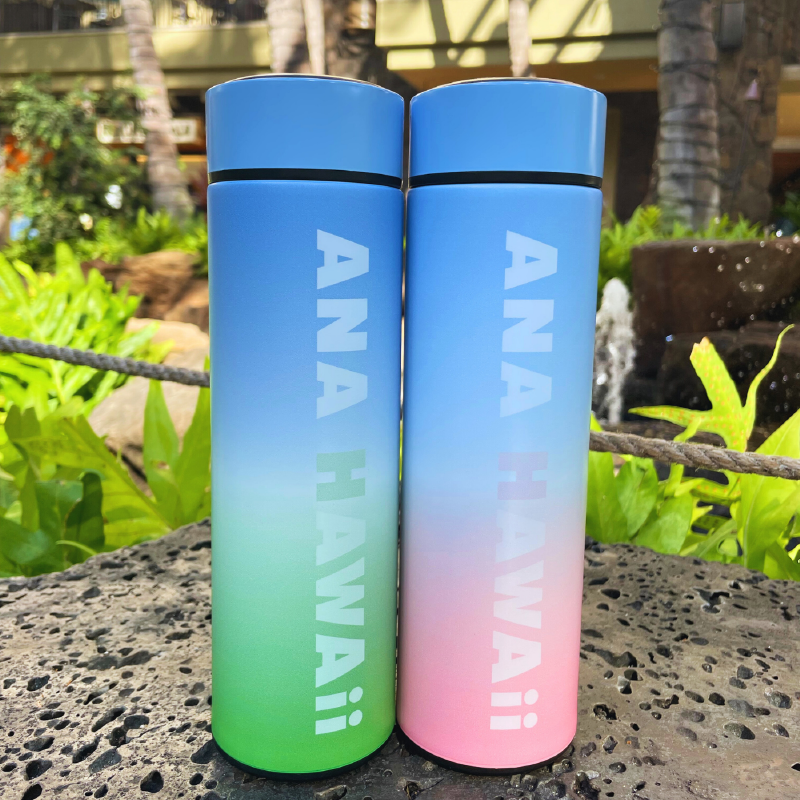 飲み物を長時間保温・保冷可能。取り外しが可能な茶葉フィルター付きの水筒で、お茶やフルーツティーにも最適です。ハワイらしいスカイブルーに、鮮やかなグリーンのデザインです。 サイズ:幅 6.35cm x 高さ 21.59cm