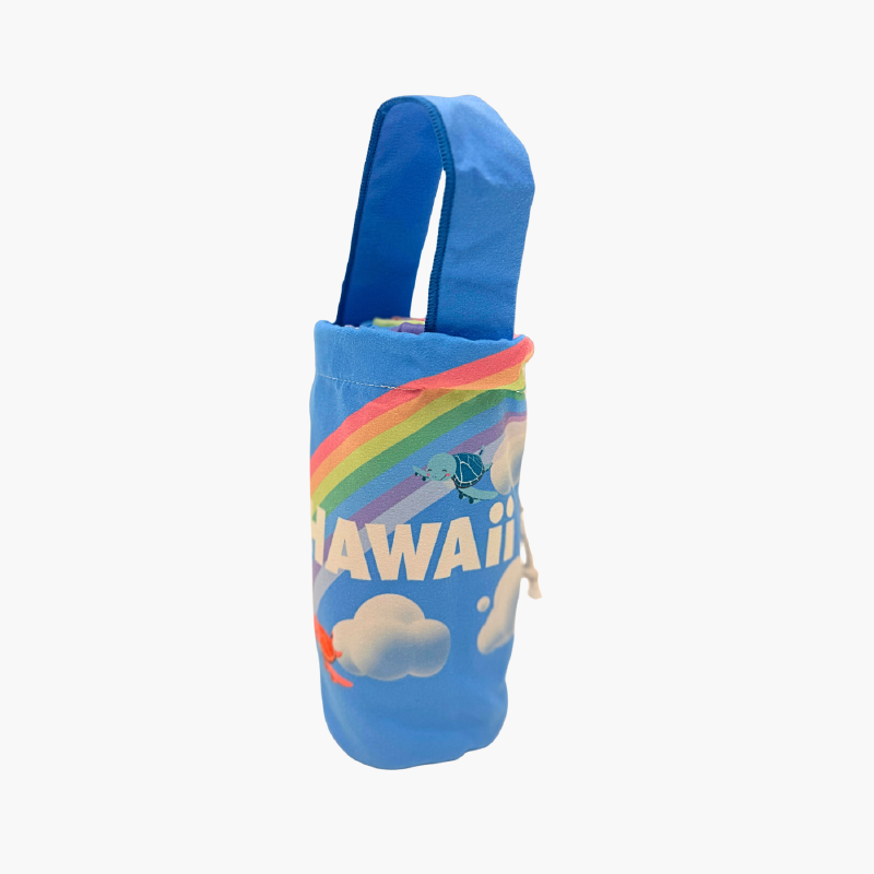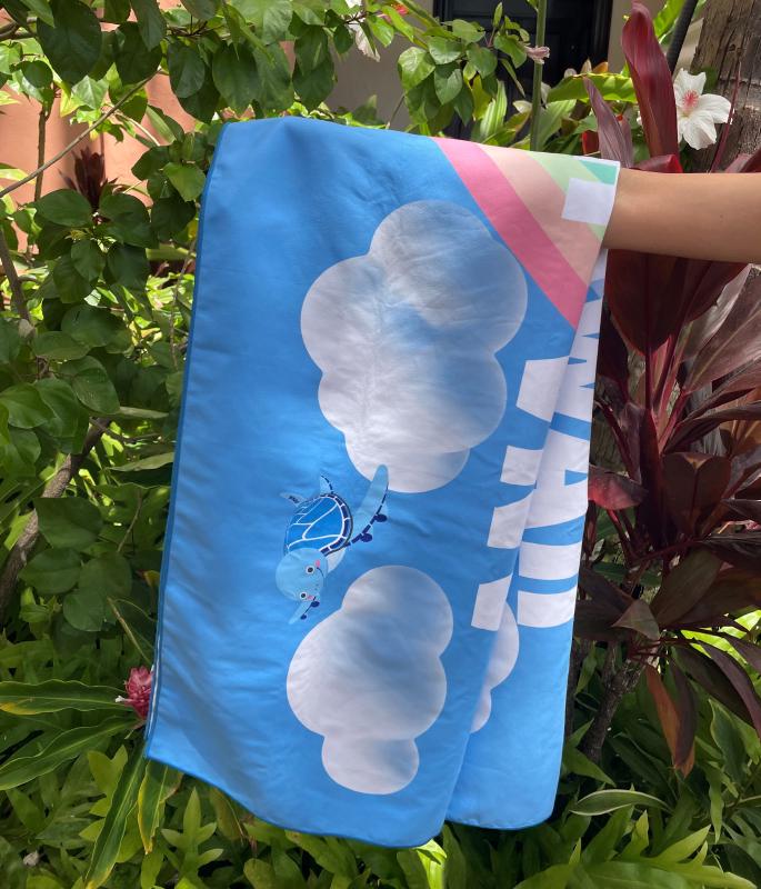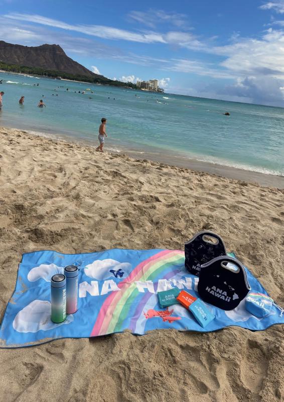 ハワイの空と海をイメージした「カイ・ラニ・ラー」と、幸運の象徴・虹をあしらった華やかなデザイン。 ビーチタオルとしてはもちろん、ビーチマットやひざ掛けとしても使えるマルチな1枚です。 マイクロファイバー素材で乾きやすく、砂もつきにくいから使い心地も快適。実用性もしっかり兼ね備えたアイテムです。 サイズ:幅 144cm x 高さ 73cm